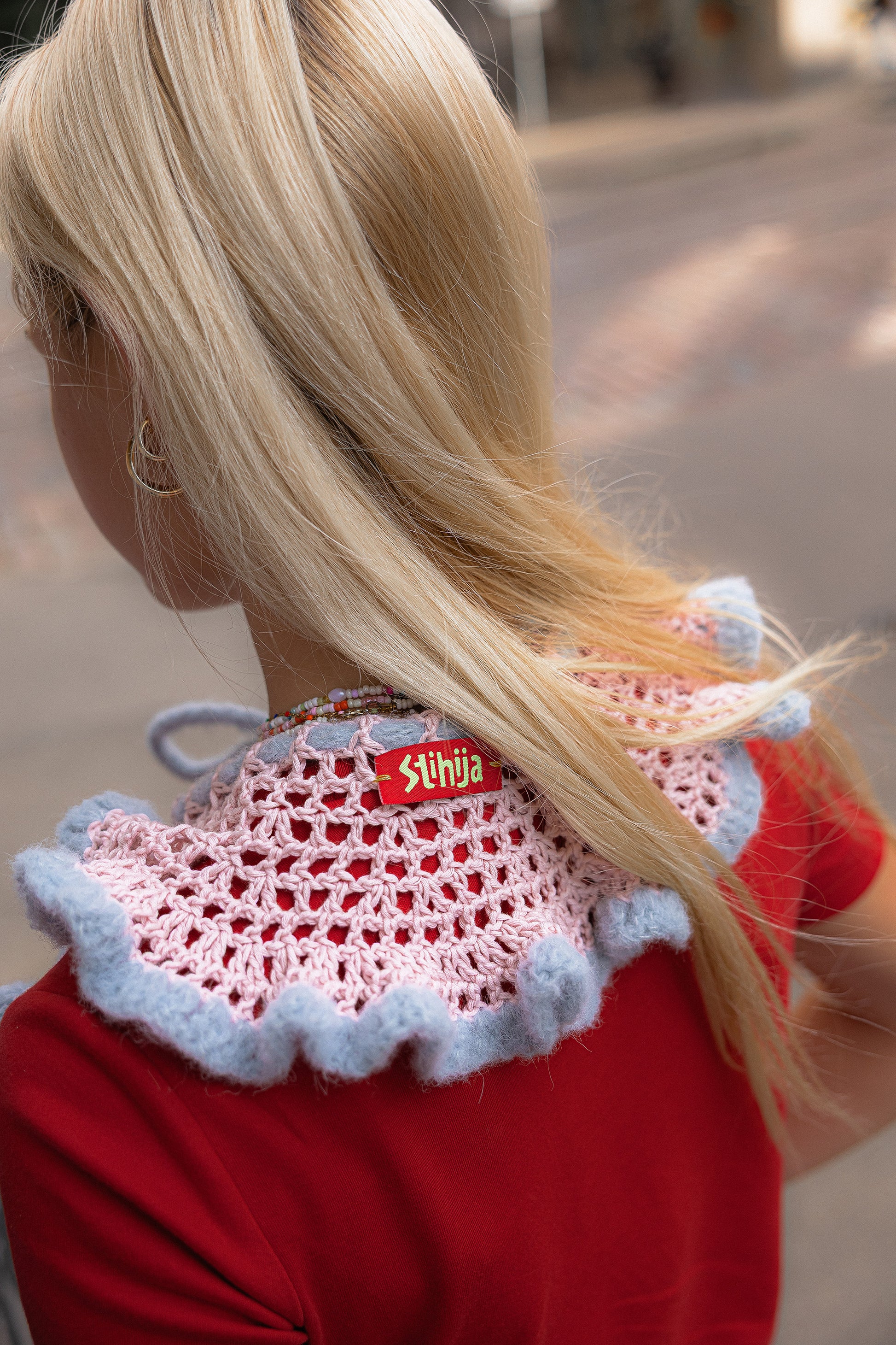 This pastel crochet collar is handmade, combining breathable cotton with luxurious alpaca and silk. Lightweight yet bold, it’s the perfect accent to refresh and elevate any look.